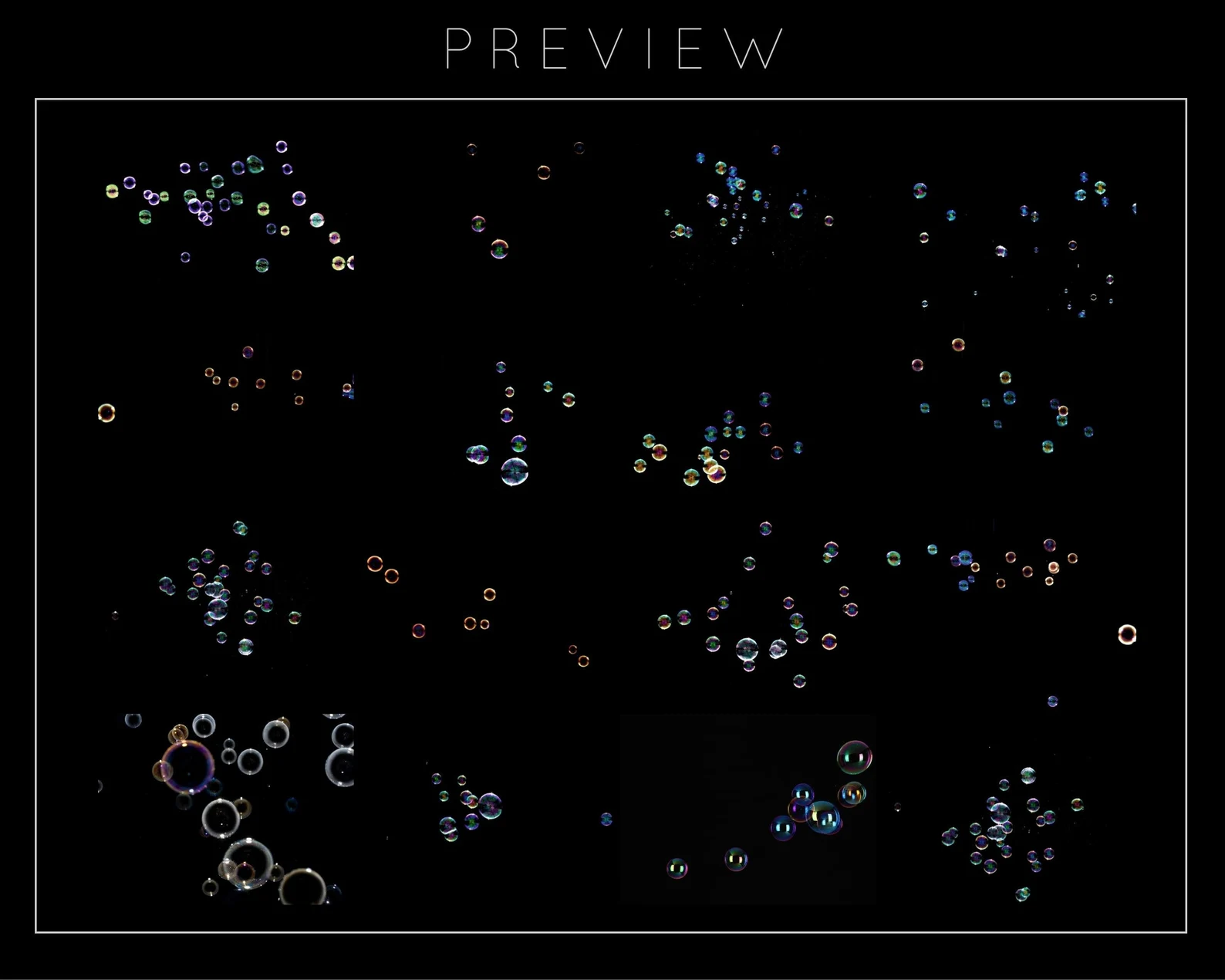 Enhance your edits with these high-quality, realistic floating bubble overlays. This collection includes 80 diverse overlays, perfect for adding beautiful, lifelike bubbles to any project.